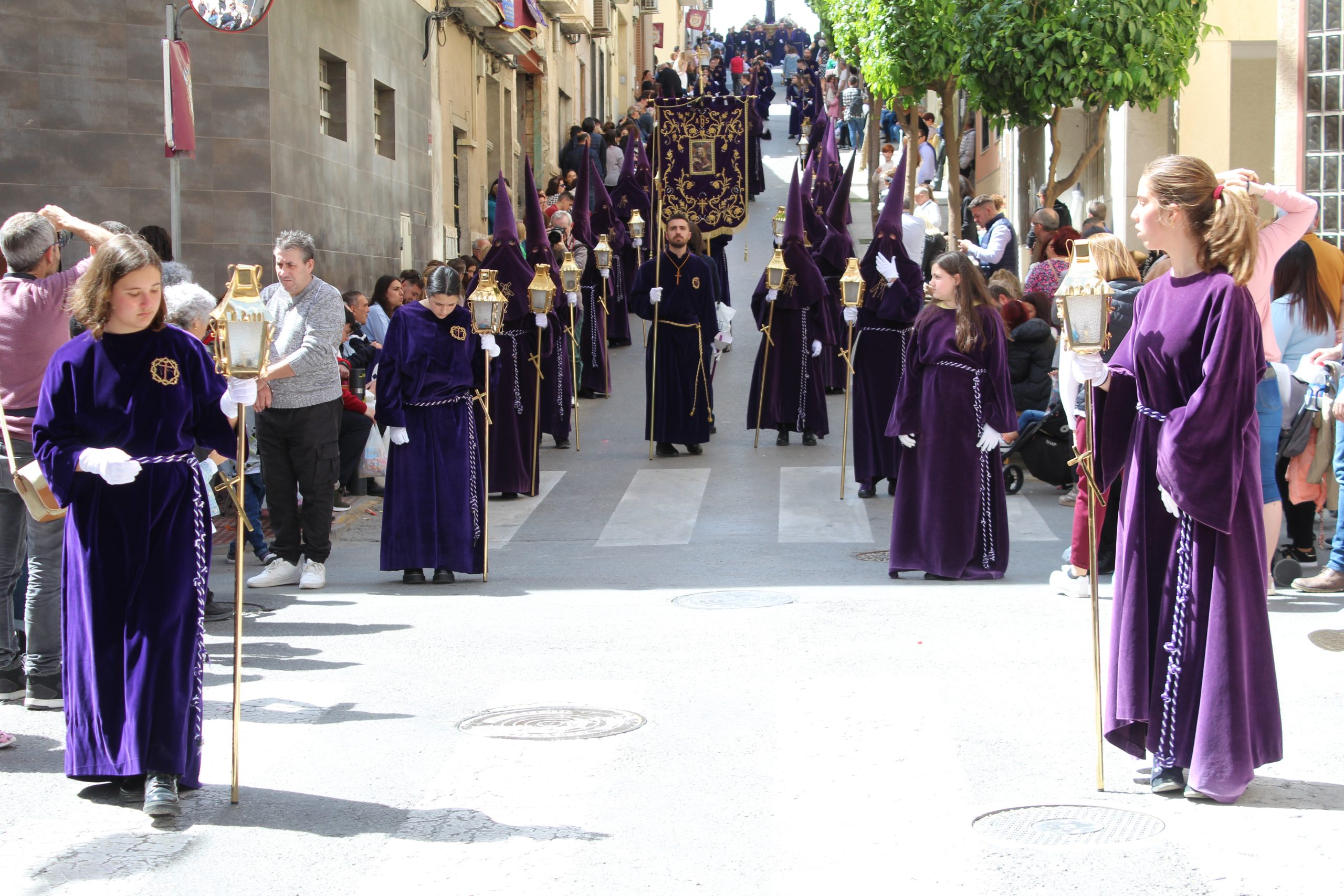 AUTOR DEL ESTANDARTE Y AÑO DE REALIZACIÓN: Bordado por Mari Nieves Mas en terciopelo morado y en el centro la lámina pintada por Julio Quesada Guilabert. Se bendijo el 7 de abril de 2000 por el padre misionero de la Consolata, Manuel García Candela.