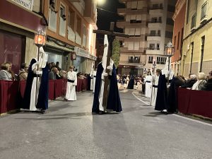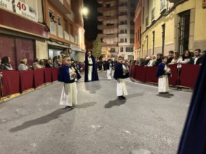 COLORES DE LA COFRADÍA/VESTA: Túnica color hueso, Fajín de terciopelo azul marino, capirote color hueso y capa de terciopelo azul marino con el escudo bordado.